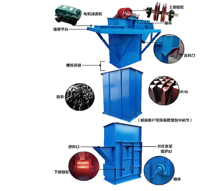 TD160皮帶斗式提升機(jī)的機(jī)身中部為標(biāo)準(zhǔn)節(jié)段,可根據(jù)實(shí)際安裝空間靈活調(diào)整高度;進(jìn)料口可根據(jù)物料特性設(shè)計(jì)為掏取式或流入式,確保喂料順暢。