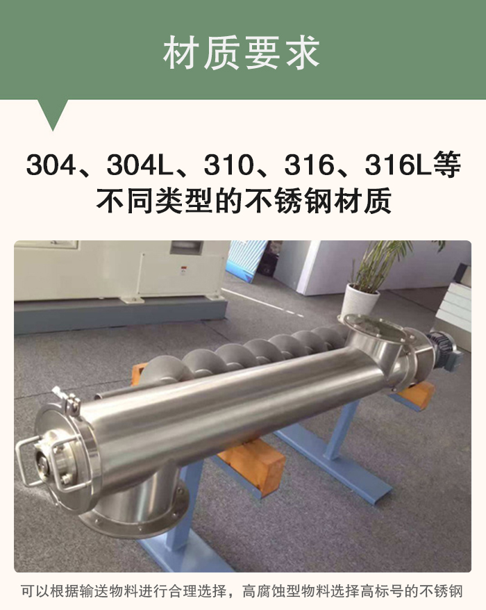 不銹鋼螺旋輸送機(jī)適合輸送腐蝕性粉狀、顆粒狀及小塊狀物料,一般情況下,其材質(zhì)可以分為304、304L、310、316、316L等不同類型的不銹鋼材質(zhì),可以根據(jù)輸送物料進(jìn)行合理選擇,高腐蝕型物料選擇高標(biāo)號的不銹鋼,如316、316L不銹鋼材質(zhì),要是簡單的濕度比較大,腐蝕較弱就可以選擇304不銹鋼材質(zhì)。