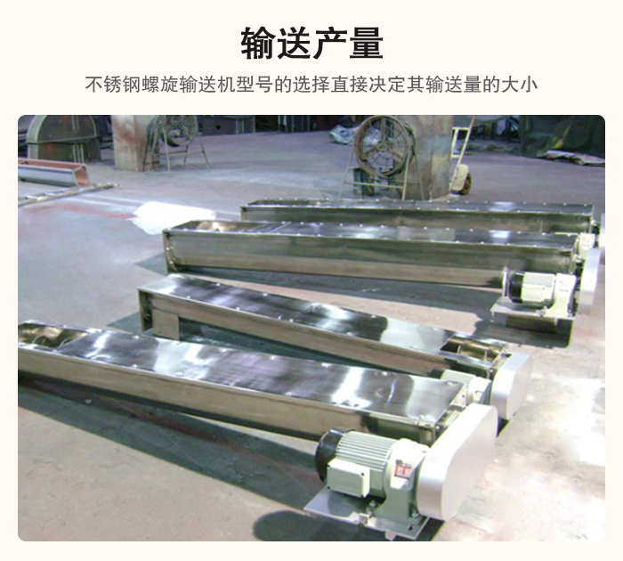不銹鋼螺旋輸送機(jī)輸送量的大小直接決定其型號的選擇,在實際選型中,用戶需要告知廠家其每小時需輸送的產(chǎn)量,長度或輸送傾角,相對應(yīng)的板材厚度、電機(jī)功率、管壁厚度都會有所變化,方便不銹鋼螺旋輸送機(jī)廠家提供合適的方案。