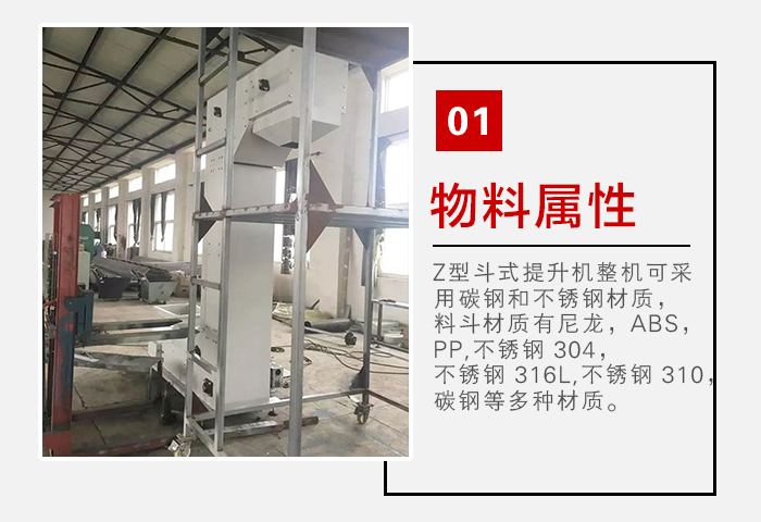 z型斗式提升機整機可采用碳鋼和不銹鋼材質(zhì),料斗材質(zhì)有尼龍,ABS,PP,不銹鋼 304,不銹鋼 316L,不銹鋼 310,碳鋼等多種材質(zhì),根據(jù)物料的酸堿性、是否具備高溫及應(yīng)用場合可選擇不同材質(zhì)的機殼和料斗。
