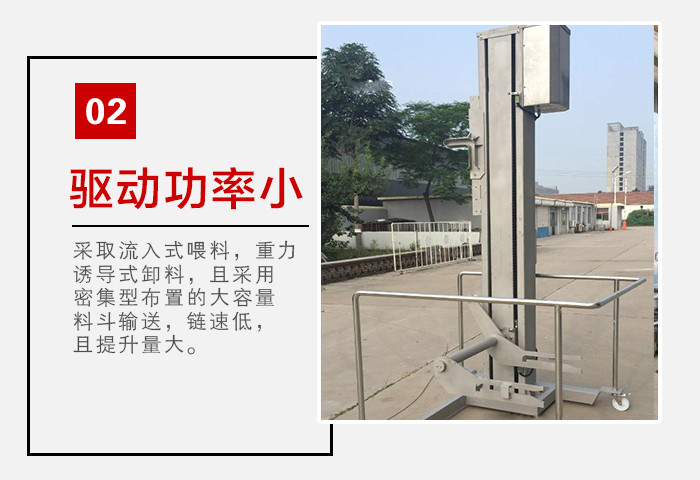 4、驅(qū)動功率?。哼@類提升機采取流入式喂料,重力誘導(dǎo)式卸料,且采用密集型布置的大容量料斗輸送,鏈速低,且提升量大。物料提升時,幾采無回料和挖料現(xiàn)象,因此無效功率少,理論計算軸功率是環(huán)鏈提升機的45%左右 。