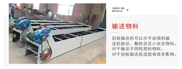 1、輸送物料刮板輸送機可以水平或傾斜輸送機粉狀、顆粒狀及小塊狀物料,對于輸送不同性質(zhì)的物料,對于刮板輸送機選型有很多影響,如輸送高溫性質(zhì)的物料可以選擇耐熱型材質(zhì),即耐高溫型刮板輸送機。